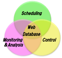 監視・制御・スケジューリングの各機能がWeb+DBを中心に有機的に結合されています